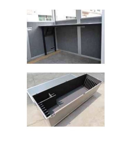Кабіна складається з окремих панелей і легко збирається без необхідності застосування спеціального інструменту. Кожна панель товщиною 35 мм виготовлена з алюмінієвого каркаса та вогнетривкої фанери зі спеціальним звукоізоляційним облаштуванням із скловолокна. Внутрішнє оздоблення виконане зносостійким 100% поліестером з 9 мм бавовняним наповнювачем щільністю 60 гр/м. Алюмінієвий профіль оснащений унікальними гачковими з’єднувачами.