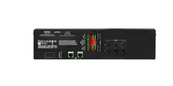 Модуль керування Biamp Cambridge Qt X 300/300D - це генератор звукового маскування, контролер, третьоктавний еквалайзер та підсилювач з двома допоміжними аудіовходами для розповсюдження аудіо з пейджингових мікрофонів та/або (фонових) музичних програвачів. Qt X 300/300D контролює до трьох зон стандартних або активних випромінювачів Qt. Модуль керування рекомендується для створення систем звукового маскування в приміщеннях площею до 3345 м2. Кожна зона має незалежне регулювання, як рівнів та спектрів сигналів маскування, так і додаткових вхідних звукових сигналів. Обидві моделі повністю сумісні з програмним забезпеченням для керування системою Biamp SageVue™. Якщо декілька модулів керування включені в єдину систему, аудіовходи можуть бути спільними для всіх цих контролерів і передаватись через AVB або Dante (модель 300/D).Додаткова конфігурація модуля доступна через веб-інтерфейс управління або з віддаленого робочого столу, використовуючи мережеве з’єднання пристрою з програмним забезпеченням Qt X.